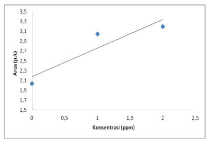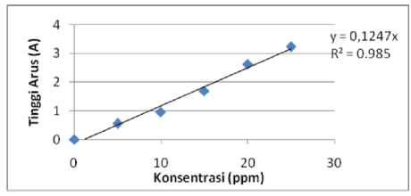 Gambar 2 menunjukkan rentang konsentrasi yang memberikan hubungan yang linier terhadap tinggi arus puncak Cr(III). Persamaan korelasi yang diperoleh adalah y = 0,1247x dengan regresi linier sebesar 0,9850. Dibawah kondisi optimal puncak arus yang linier dengan rentang konsentrasi Cr(III) 5 – 25 ppm diperoleh batas deteksi sebesar 4,6889 ppm dengan standar deviasi sebesar 0,1949 akurasi sebesar 96,17% dan presisi 98,19%. Hasil ini menunjukkan bahwa ketepatan pengukuran dari metode ini cukup baik untuk penentuan Cr(III).