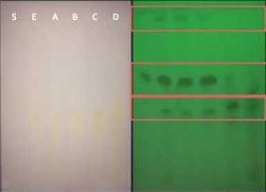 Gambar 1. KLT Bioautografi (S: standar alpha mangosten, E: ekstrak dan A,B,C,D: sampel)