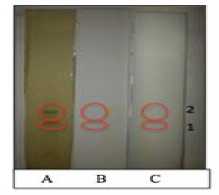 Gambar 2. Secara Visual Untuk Identifikasi Golongan Senyawa Pada Fraksi dengan menggunakan fase diam: plat silika gel GF254 dan fase gerak: kloroform:metanol (9,5:0,5 v/v) (A: pereaksi FeCl3, B: pereaksi AlCl3, C: pereaksi Citroborat)