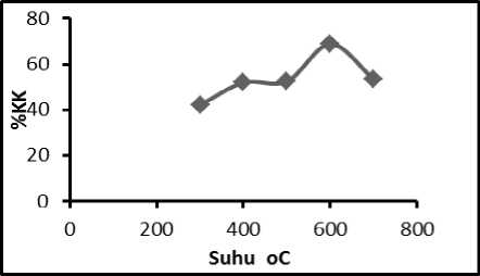 Hasil karakterisasi terhadap arang yang dihasilkan pada proses pemanasan dari suhu 300oC hingga 700oC, menunjukkan bahwa suhu optimum karbonisasi adalah 600oC karena dengan suhu ini dihasilkan arang yang memenuhi standar SNI-95, dengan rendemen 20,46% dan kadar karbon (KK) sebesar 68,87% (Gambar 1, Tabel 1 berikut).