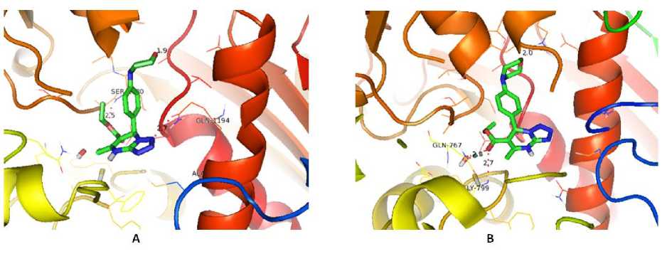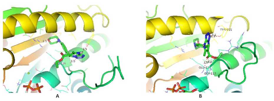 Gambar 5. Visualisasi 3D interaksi ligan R-MDP(A) dan S-MDP(B) dengan reseptor Kinesin Eg5