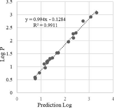 Log P = -7.103 + (-0.005*PSA) + (-0.729*MR) + (0.003*Volume) + (0.002*SA) + (-99.912*Homo) + (-38.893*Lumo)+ (-0.072*MD)+ (0.006*Eh) + (1.409*P).