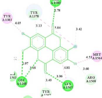 Figure 3 shows the structure of the molecule if the OH group on the C atom numbers 3, 4, and 4' that had been replaced with Cl and the C atom number 3' with OCH3 which caused the binding energy and the inhibition constant to decrease. The lower the binding energy caused the compound to be stable and could become colonic anticancer compounds. The results obtained from molecular docking were the binding energy of -9.94 kcal/mol and the inhibition constant of 51.54 nM. SER 2.78 TYR ; TYR A:1378 ∙ ≡ER A:1383 A:1379 4.65 343 ’« 3.42 MET 2.96 i I 1 453A1564 A:1269 * ; JΛ8 4-81 j60 AKO „ 563 ARQ θLY 3’4° A1568 A:1268 LYS A:1565 TYR A:1267 PRO A1266 Interactions CZl van der Waals ∏ Pi-Donor Hydrogen Bond ■1 Conventional Hydrogen Bond i ] Alkyl EZl Carbon Hydrogen Bond IB Pi-Alkyl Figure 4. Visualization of Amino Acid Interaction between Ellagic Acid and Leukotriene A4 Hydrolase Protein by Biovia Discovery Studio 2019 Software Ellagic acid compounds that interact via hydrogen bonds with the residue of Leukotriene A4 Hydrolase in colon cancer is the amino acid Gly1268 which bonded to the OCH3 group (2.97 Å), Gly1268 bonded to the ether group (3.18 Å), Lys 1565 bonded to the ketone group (3 , 06 Å) and Ser1380 bond to the ketone group (2.78 Å). CONCLUSION The QSAR equation model is shown with the results: Log P = -7.103 +(- 0.005*PSA) + (-0.729*MR) + (0.003*Volume) + (0.002*SA) + (- |