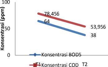 Hasil analisis menunjukan terjadi penurunan konsentrasi rata-rata BOD5 dan COD dari air limbah effluent IPAL (T1) setelah melewati sistem filtrasi-biologis (T2). Pada sistem ini diperoleh persentase penurunan rata-rata konsentrasi untuk pengolahan BOD5 sebesar 41,17 % dan COD sebesar 31,23 %. Nilai penurunan konsentrasi BOD5 dan COD disajikan pada Gambar 1.