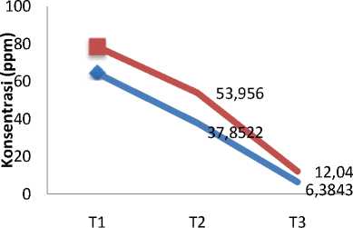 Hasil Analisis menunjukan terjadi penurunan kembali konsentrasi rata-rata BOD5 dan COD dari air limbah setelah melewati sistem Pre-Ozonation (T2). Pada tahap pengolahan ini diperoleh persentase penurunan rata-rata konsentrasi untuk pengolahan BOD5 sebesar 83,13 % dan COD sebesar 77,68 %. Nilai penurunan konsentrasi BOD5 dan COD pada Gambar 2.