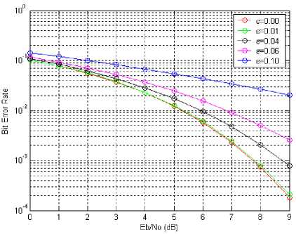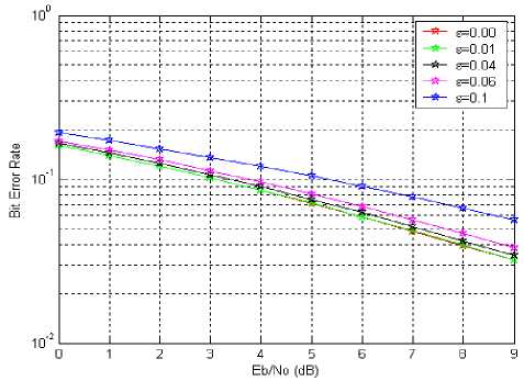 Fig. 4. BER vs. Eb/No for OFDM with ε=0.01, 0.04, 0.06 and 0. 1 in Rayleigh fading channels, no cancellation scheme is applied.