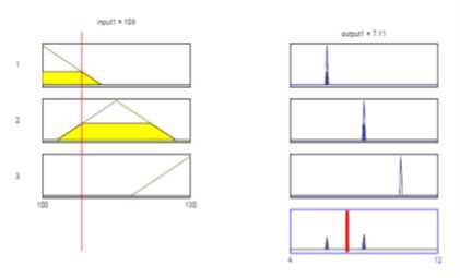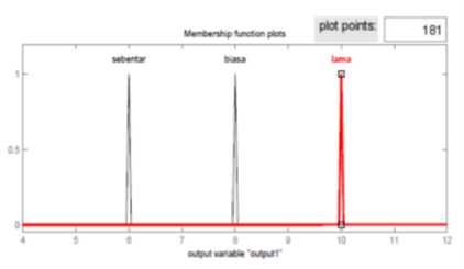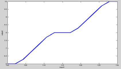 Based on the fuzzy logic controller design above, the resolution of COA defuzzyfication (center of area) in the view rule is obtained as can be seen in Fig. 5, while the surface view looks like Fig. 6