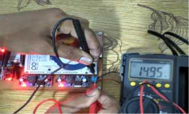 The power supply used by each device is 12 volts DC which is sourced from the step down which is installed in each device. For each device circuit will use a voltage source of 5 volts so a step down module is needed. Here two LM2596 modules are used, each to supply a microcontroller and a sensor. Tests conducted for power supply is to measure directly the output of the step down module used. Test images can be seen in Fig.6.