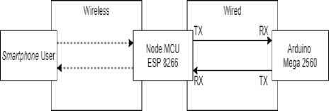 So that the system can run the command IoT, 2 microcontrollers are used. The first microcontroller is ESP 8266, ESP 8266 functions as a WIFI module or an intermediary between the user and the system that will receive all commands from the user's mobile phone. Three orders can be received and sent ESP 8226 to the slave, namely cooking rice, checking the availability of rice, and checking the availability of water. All command data received by ESP 8266 will then be sent to Arduino Mega 2560 (slave). Arduino Mega 2560 which is the second microcontroller as the brain of the system that will run all the commands requested by the user. Data transmission communication between ESP 8266 and Arduino Mega uses UART serial communication [6]. UART type serial communication was chosen because it is easy in the operating system, the use of a small path, and between the