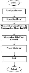 in the data. The normalized data then looks for the best K value using the Elbow method and the Davies Bouldin Index. After the K value is obtained, the labeling clustering process can be carried out, each cluster will be calculated intra and inter-cluster distances which aim to find out how far the distance between the data and the cluster is and how far the cluster is from other clusters. In the data, each cluster has an extreme value, the extreme is the value that deviates much from the other data, and then the extreme value is searched for each cluster and looks for the cohesion and separation values. After the cohesion and separation values are obtained, the next step is to calculate the silhouette coefficient to determine the average distance between the data and other cluster data.