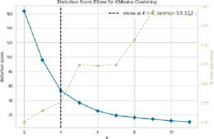 Figure 2 is the result of the application of the Elbow method. It can be seen that the output produces an angle that forms an angled pattern and produces a K value of 4 with a score of 53,172