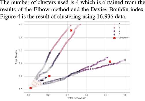 In this study, the label generated for the COVID-19 dataset in Indonesia is called a cluster. Figure 5 is the result of data labeling with the name cluster 0, 1, 2, and 3. In cluster 0 there is a total of 15315 data. In cluster 1 there is a total of 222 data. Cluster 2 have a total of 208 data. And in Cluster 3there is a total of 208 data.