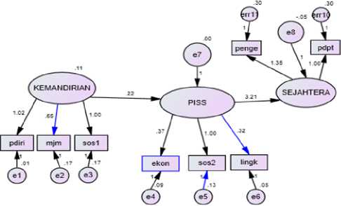 dapat diketahui bahwa (i) adanya pengaruh antara kemandirian dan pengelolaan integrasi sawit sapi berkelanjutan. “P value” = 0,036 sehingga signifikan pada level 5%; (ii) adanya pengaruh antara pengelolaan integrasi sawit sapi berkelanjutan dan kesejahteraan petani. “P value” = 0,046 sehingga signifikan pada level 5%; (iii) adanya pengaruh antara manajemen dan kemandirian petani. “P value” = 0,000 sehingga signifikan pada level 1% ; (iv) adanya pengaruh antara pembinaan diri dan kemandirian petani. “P value” = 0,000 sehingga signifikan pada level 1% ; (v) tidak ada pengaruh antara aspek lingkungan dan pengelolaan integrasi sawit sapi berkelanjutan. “P value” = 0,302 sehingga tidak signifikan ; (vi) tidak ada pengaruh antara aspek ekonomi dan kesejahteraan petani. “P value” = 0,351 sehingga tidak signifikan; (vii) adanya pengaruh antara pengelolaan integrasi sawit sapi berkelanjutan terhadap kesejahteraan petani. “P value” = 0,000 sehingga signifikan pada level 1%. Pembahasan