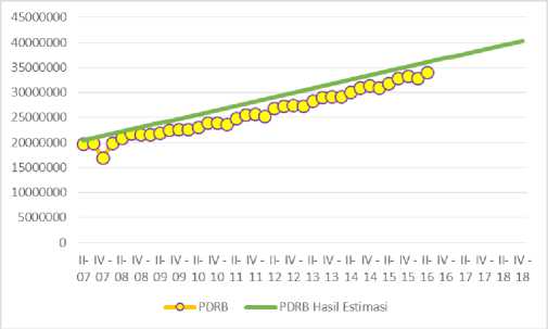 Dimana adalah perubahan dari PDRB. Untuk memperoleh proyeksi dari PDRB maka perubahan PDRB pada tahun ke-t ditambahkan dengan PDRB tahun sebelumnya. Dari model tersebut maka diperoleh PDRB hasil peramalan dengan model ARIMA (3,1,0) yang dapat dilihat pada tabel 7. Ramalan moderat diperoleh dengan menggunakan eviews. Sedangkan ramalan pesimis dan optimis diperoleh dari batas bawah dan batas atas pada derajat kepercayaan 95 persen.