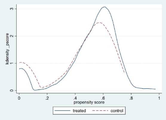 Common Support is one of the important assumptions when applying PSM. This step is very important in matching estimates to ensure there is an overlap between the treatment and control groups. As a result, it can be ensured that the match for the group that was intervened and the group that was not intervened could be found (Khanker, 2010). The common support area is analyzed by visual analysis using the propensity of kdensity score chart analysis.