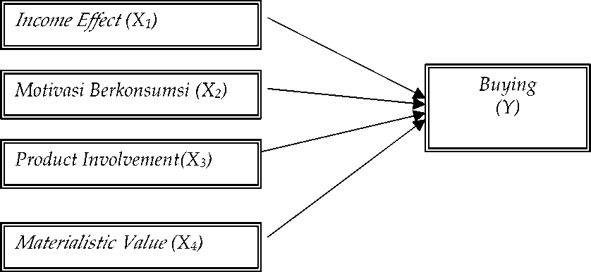 Penelitian ini difokuskan kepada empat variabel bebas. Variabel bebas pertama adalah efek pendapatan yang diterima konsumen, di mana efek pendapatan merupakan nilai valuasi dasar yang mendorong individu untuk melakukan konsumsi (Goldfarb and Prince,2008). Variabel bebas kedua adalah terkait dengan motivasi berkonsumsi, dimana motivasi berkonsumsi dapat berhubungan dengan dua hal pertama berorientasi pada kebutuhan dan kedua berorientasi pada rekreasi bagi individu (Westbrook and Black, 1985). Variabel bebas ketiga adalah pengetahuan akan produk. Pengetahuan akan produk sendiri didefinisikan sebagai tingkat pengetahuan dan kepedulian terhadap produk bagi konsumen . Variabel bebas keempat adalah materialistic value yang didefiniskan sebagai pernyataan penting terhadap kecenderungan secara sosial menilai kesuksesan orang lain dengan hal-hal materi yang diakuisisi. Variabel terikat dalam penelitian ini adalah cara berkonsumsi kelas menengah kota Surabaya apakah termasuk planned consumption ataukah impulse buying consumption.