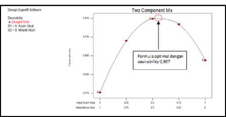Hasil formula optimal yang diperoleh dari simplex lattice design yaitu formula dengan perbandingan asam oleat:minyak atsiri bunga cempaka putih (0,549:0,451) dengan nilai desirability sebesar 0,907. Grafik hubungan antara komponen asam oleat dan minyak atsiri bunga cempaka putih terhadap nilai desirability dapat dilihat pada gambar 4.4 bawah ini.