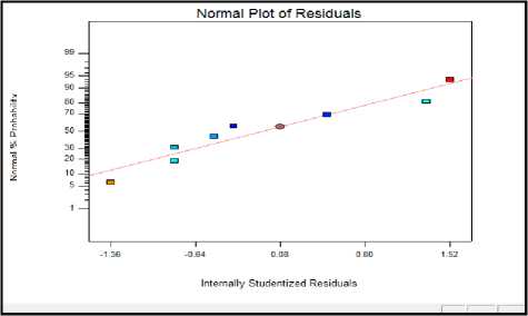 Hasil Normal Plot of Residuals pada gambar 2 menunjukkan bahwa nilai respon uji persentase susut pengeringan matrik patch terdistribusi secara merata mengikuti garis linier, yang artinya nilai respon akan memberikan hasil yang baik. Pada gambar 3 dapat dilihat bahwa hasil respon persentase susut pengeringan matrik patch transdermal tidak ada yang berada diluar garis linier. Hal ini menunjukkan bahwa tidak terdapat data pencilan dan besarnya variasi data pada kedelapan run selama percobaan masih dapat diterima sehingga tidak perlu dilakukan formulasi ulang.