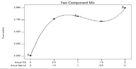 propilenglikol:mentol (2:0) yang memiliki nilai desirability 0,986 dan formula kedua dengan komposisi propilenglikol:mentol (0,791:1,209) yang memiliki nilai desirability 0,851.