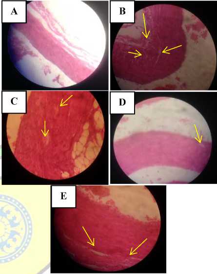 Keterangan: (A) = kelompok normal, (B) = kelompok negatif, (C) = Perlakuan 1, (D) = Perlakuan 2 dan (E) Perlakuan 3. Gambar yang ditunjukkan oleh tanda panah ( ) menunjukkan terjadinya inflamasi dan terbentuk sel busa.