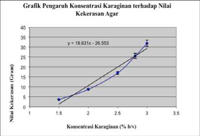 Kadar agar yang dipakai oleh media komersial adalah 1,5% (b/v). Dengan kadar tersebut, kekerasan media yang dimiliki adalah 25,6 + 1,2 gram atau agar tersebut mulai rusak bila diberi beban sebesar 25,6 + 1,2 gram. Untuk mendapatkan nilai kekerasan yang sama dengan nilai yang dimiliki oleh 1,5% agar pada media komersial, maka dilakukan percobaan dengan mengukur kadar karaginan hasil ekstraksi dengan tingkat kekerasan media yang dihasilkan. Hasilnya ditunjukkan pada gambar 2.