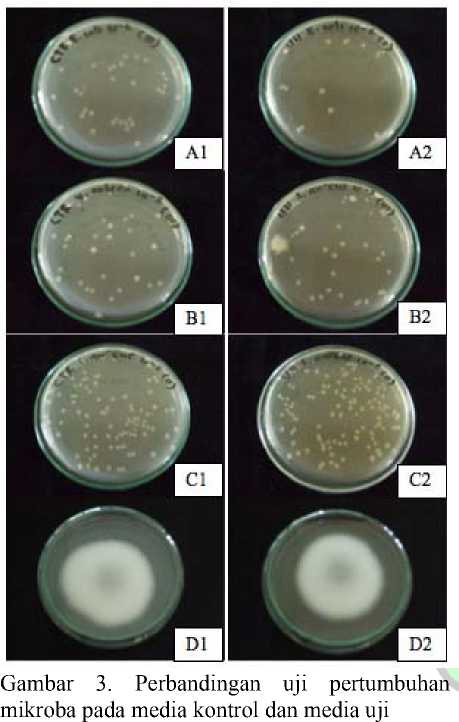 Keterangan : A1 : pertumbuhan E. coli pada media kontrol, A2 : pertumbuhan E. coli pada media uji, B1 : pertumbuhan V. colera pada media kontrol, B2 : pertumbuhan V. colera pada media uji, C1 : pertumbuhan S.aureus pada media kontrol, C2 : pertumbuhan S.aureus pada media uji, D1 : pertumbuhan Rhizopus sp. pada media kontrol, D2 : pertumbuhan Rhizopus sp.pada media uji.
