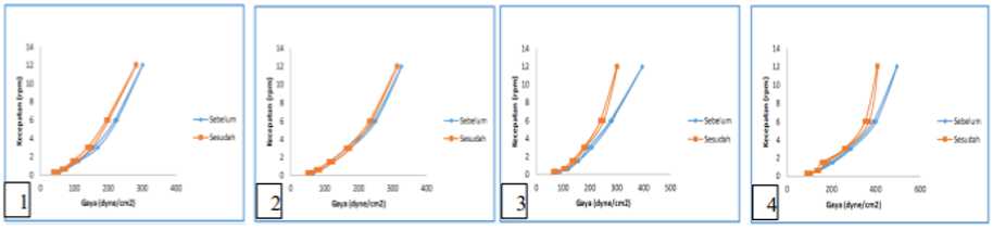 Gambar. 1: Hasil Viskositas cycling test; (1) Blanko, (2) Formula 1, (3) Formula 2, (4) Formula 3