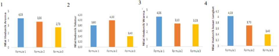 Gambar. 3: Hasil Uji Hedonik terhadap (1) Aroma, (2) tekstur, (3) Warna, dan (4) Rasa Lengket