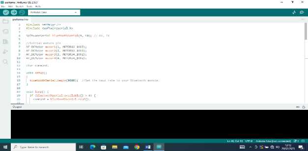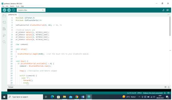 Untuk membangun sebuah sistem dengan mikrokontroler, diperlukan sebuah aplikasi bernama Arduino IDE yang digunakan untuk membuat perintah atau sering disebut dengan coding program. Intinya, pengkodean yang disusun membantu memberikan perintah ke Bluetooth HC-05 sesuai dengan kondisi yang diperlukan. Dengan kata lain, penyedot debu dengan sistem kontrol yang diberdayakan Android membersihkan lantai yang kotor. Gambar 4.2 di bawah ini adalah software Arduino IDE yang berisi kode untuk diupload ke mikrokontroler untuk sistem robot vacuum.