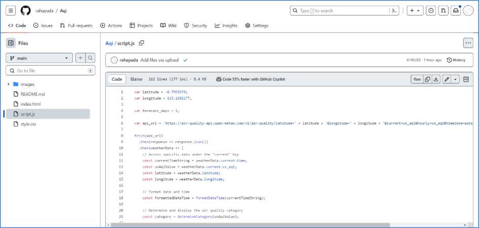 Menerapkan desain ke dalam kode sumber Sistem Monitoring Indeks Kualitas Udara melibatkan integrasi HTML, CSS, dan JavaScript sebagai komponen utama. HTML digunakan untuk menentukan struktur dan elemen-elemen pada halaman web, CSS bertanggung jawab atas penataan dan tampilan estetika, sementara JavaScript memberikan fungsionalitas dinamis dan interaktivitas pada halaman. Dalam repository GitHub, terdapat tangkapan layar (screenshot) yang mencerminkan struktur folder dan berkas serta beberapa cuplikan kode krusial terlihat pada gambar 1. index.html merupakan berkas utama yang menentukan struktur dan konten dari halaman web. Di dalamnya, elemen-elemen HTML ditempatkan untuk membangun antarmuka pengguna. Struktur yang terorganisir memudahkan pemahaman dan pemeliharaan kode. script.js adalah berkas JavaScript yang memberikan logika dan interaktivitas pada halaman. Dengan menggunakan JavaScript, Sistem Monitoring Indeks Kualitas Udara dapat mengambil data dari API, memproses informasi, dan mengupdate tampilan secara dinamis tanpa perlu me-refresh halaman. style.css berperan dalam mendefinisikan tata letak dan tampilan estetika elemen-elemen HTML. Melalui CSS, warna, ukuran, dan posisi elemen dapat diatur untuk menciptakan antarmuka pengguna yang menarik dan mudah dibaca.