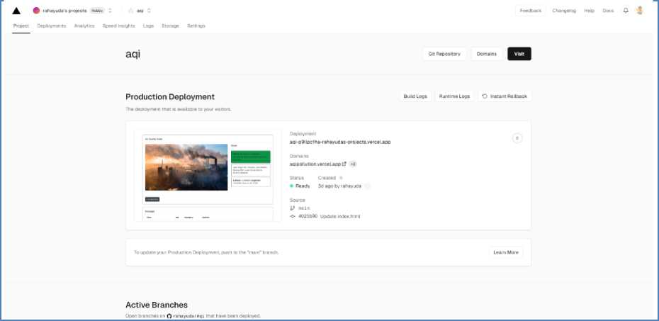 Proses hosting web merupakan langkah krusial dalam menghadirkan sebuah proyek secara daring. Dalam konteks Sistem Monitoring Indeks Kualitas Udara, proyek ini dihosting menggunakan platform Vercel yang terintegrasi secara langsung dengan GitHub. Integrasi ini mempermudah pengelolaan proyek dan penerapan perubahan, membuatnya menjadi pilihan yang efisien bagi pengembang. Vercel adalah platform cloud yang memungkinkan pengguna untuk menyimpan dan mendeploy proyek web secara cepat dan mudah. Dengan integrasi GitHub, setiap kali terjadi perubahan pada repositori GitHub, Vercel secara otomatis memicu proses pembangunan (build) dan merilis (deploy) versi terbaru dari proyek. Hal ini memastikan bahwa proyek selalu tersedia dalam kondisi terkini. Keuntungan utama dari integrasi Vercel dan GitHub adalah efisiensi pengelolaan kode sumber dan implementasi perubahan. Proses deployment yang otomatis menghilangkan kebutuhan untuk melakukan langkah-langkah manual, sehingga pengembang dapat lebih fokus pada pengembangan fitur dan fungsionalitas proyek seperti terlihat pada gambar 2. Selain itu, Vercel menyediakan URL unik yang mudah diingat (https://aqipollution.vercel.app), memudahkan pengguna untuk mengakses Sistem Monitoring Indeks Kualitas Udara secara daring dengan cepat.