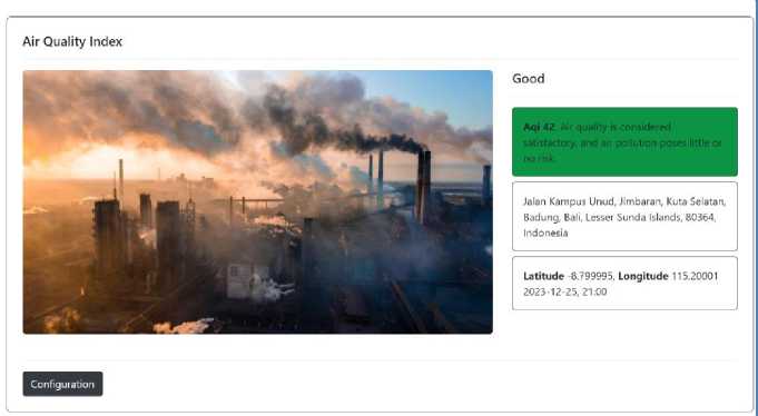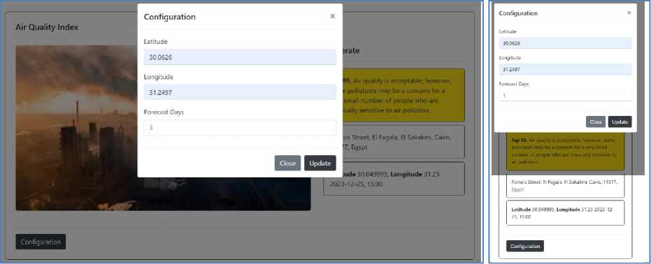 Dalam pengembangan Sistem Monitoring Indeks Kualitas Udara, responsivitas dan tampilan yang estetis menjadi fokus penting. Untuk mencapai hal ini, proyek ini memanfaatkan Bootstrap, sebuah kerangka kerja CSS yang terkenal, untuk merancang antarmuka yang responsif dan menarik. Bootstrap menyediakan berbagai komponen dan utilitas yang mempermudah pengembangan tata letak yang responsif tanpa harus menulis banyak kode CSS kustom. Tampilan web versi desktop dari Sistem Monitoring Indeks Kualitas Udara mencerminkan desain yang bersih dan terorganisir. Pengguna dapat dengan mudah membaca informasi mengenai kategori indeks kualitas udara, nilai AQI, dan detail lokasi. Tata letak ini memberikan pengalaman pengguna yang intuitif dan informatif. Selain itu, responsivitas proyek ini dijamin melalui penggunaan Bootstrap, yang mengoptimalkan tampilan web saat diakses melalui perangkat mobile. Dengan demikian, pengguna dapat mengakses Sistem Monitoring Indeks Kualitas Udara dengan lancar tanpa mengalami kesulitan tata letak atau keterbacaan, seperti terlihat pada gambar 3. Sistem konfigurasi juga dihadirkan melalui modal yang dapat diakses dengan mudah. Modal ini memungkinkan pengguna untuk memasukkan data lokasi baru dan jumlah hari perkiraan cuaca dengan nyaman, terlihat pada gambar 4. Tampilan yang bersih dan sederhana memberikan pengalaman pengguna yang lebih baik dalam mengonfigurasi Sistem Monitoring Indeks Kualitas Udara