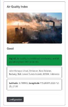 akurat sesuai dengan konfigurasi pengguna yang diberikan. Hasil pengujian Black Box menunjukkan bahwa semua fitur pada sistem telah berjalan dengan baik dan sesuai dengan harapan. Sistem berhasil memberikan respons yang tepat dan akurat terhadap konfigurasi yang diberikan, termasuk pembaruan lokasi, penggunaan Open Meteo API, dan integrasi OpenStreetMap API. Pengujian ini mencakup evaluasi terhadap kemampuan sistem dalam menampilkan indeks kualitas udara (AQI) berdasarkan lokasi geografis, konfigurasi latitude dan longitude, serta perkiraan cuaca dalam rentang waktu tertentu. Semua aspek ini telah diuji secara menyeluruh, dan hasilnya memastikan bahwa Sistem Monitoring Indeks Kualitas Udara berfungsi dengan baik sesuai dengan kebutuhan pengguna. Dengan demikian, hasil pengujian Black Box memberikan keyakinan bahwa Sistem Monitoring Indeks Kualitas Udara siap untuk digunakan secara luas, memberikan informasi yang akurat dan bermanfaat terkait kualitas udara sesuai dengan lokasi dan preferensi pengguna.