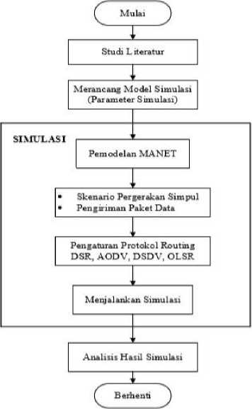 The stages begin from conducting a literature study by studying several research articles related to reactive and proactive routing protocols. The results of the research study will be used as a reference in designing simulation models, such as programs, number of nodes used, packet size, mobility models and models of propagation used.