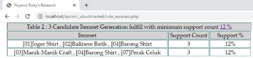 Then also From the combination of the 3 itemset that has been found one rules that can be seen the amount of support value and confidence of the candidate association rules as shown in the table :