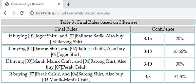 data into a MySQL database, the biggest amoun of data, is more difficult to create tabular tables. The tabular table is then connected to the php programming, and starts building support and confidence and then will produce a final association that satisfies support and confidence.