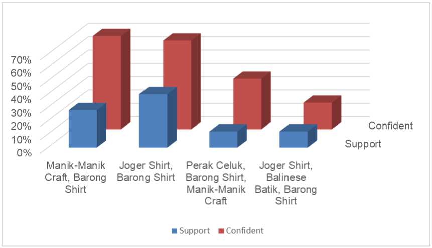 The conclusion of this research is based on the graphic above determined final rules on 2 itemset combination, If buying Manik-Manik Craft, Also buy Barong Shirt with the highest confidence 70% and Minimum Support 28%, and for 3 itemset a combination, If buying Celuk Silver, and Barong Shirt, Also buy Manik-Manik Craft with the highest confidence 37.5% and Minimum Support 12%, based on that there are 3 best-selling souvenir products, namely Barong Shirt, Manik-Manik Craft and Silver-Celuk in March 2020, with the knowledge of the most sold out products, so that Ubud Market trader can prepare to develop a marketing strategy after pandemic Covid-19 to making other products by examining what the most advantages of the product sold with other products and can increase the supply of Manik-Manik Craft, Barong Shirt, Joger Shirt and Perak Celuk in post pandemic.
