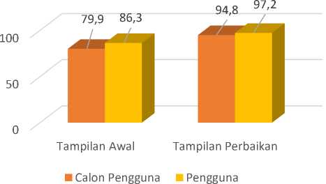 Gambar 7 ialah grafik perbandingan hasil evaluasi awal dan akhir pada kedua kategori responden yaitu calon pengguna dan pengguna. Variabel efektivitas pada kedua kategori responden mengalami peningkatan setelah dilakukan perbaikan terhadap desain awal website. Varibel efektivitas pada kategori calon pengguna meningkat dari 79.9% menjadi 94.8% setelah dilakukan perbaikan sedangkan pada kategori pengguna juga mengalami kenaikan dari 86.3% meningkat menjadi 97.2%. Grafik perbandingan hasil evaluasi pada variabel efisiensi pada kategori calon pengguna dan pengguna dapat dilihat pada Gambar 8 sebagai berikut.