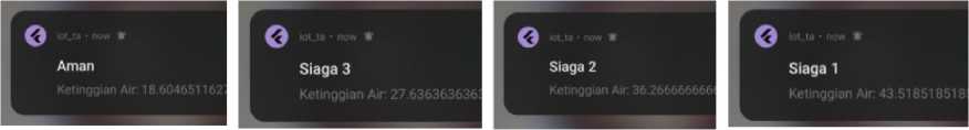 Hasil pengujian notifikasi yang dilakukan dapat dilihat pada Gambar 10. Notifikasi yang ditampilkan sudah sesuai dengan ketika ketinggian air yang diatur pada alat IoT. Notifikasi ditampilkan saat aplikasi sedang berjalan di background, sedangkan saat aplikasi sedang berjalan di foreground, data status ditampilkan pada halaman water monitoring.