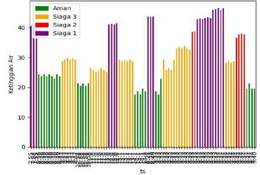 Gambar 11 merupakan tampilan grafik status ketinggian air yang didapat selama pengujian. Grafik tersebut menunjukan waktu dan status ketinggian air pada waktu ketinggian air didapatkan. Warna ungu pada grafik menunjukan status Siaga 1, warna merah menunjukan status Siaga 2, warna oranye menunjukan status Siaga 3, dan warna hijau menunjukan status Aman.