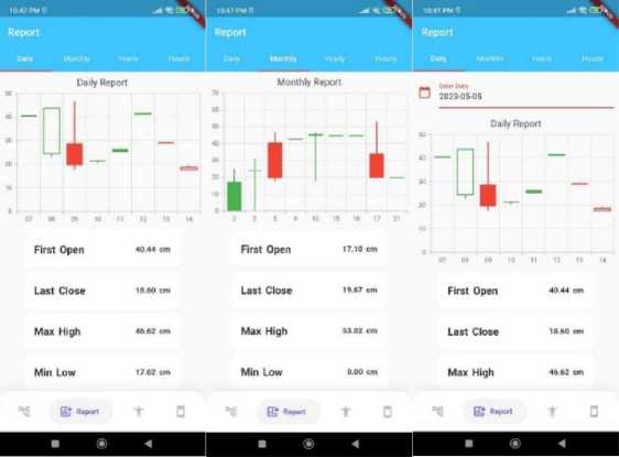 Gambar 14 menunjukan tampilan dari halaman reportDaily, report monthly, dan reportYearly pada mobile apps. Data report ditampilkan dalam bentuk grafik dan pengguna dapat memilih interval dari report. Pengguna dapat memilih tanggal, bulan dan tahun yang diinginkan untuk menampilkan data yang didapat alat IoT pada interval yang disimpan pada MySQL database.