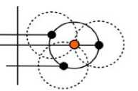 Gambar 3 merupakan ilustrasi Hough Circle Transform dimana setiap titik hitam pada tepi lingkaran dapat menggenerate lingkaran dengan radius R. Titik pusat sebenarnya dari lingkaran ditandakan dengan titik merah yang dicari menggunakan Hough Accumulation Array.