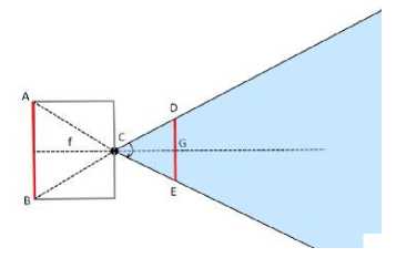 Nilai f merupakan focal lenght pada kamera, DE merupakan tinggi objek CG merupakan jarak objek ke kamera dan AB merupakan tinggi proyeksi. Rumus untuk mendapat jarak objek-kamera dapat dilihat pada Persamaan