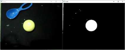 Thresholding bekerja dengan mengubah nilai pixel yang nilainya dibawah threshold ke nilai 0 dan yang nilainya diatas threshold ke nilai 1. Hasil dari proses ini adalah citra biner seperti Gambar 5 dimana threshold di konfigurasikan ke warna bola sehingga objek lain seperti sendok berwarna biru tidak terlihat pada hasil thresholding.