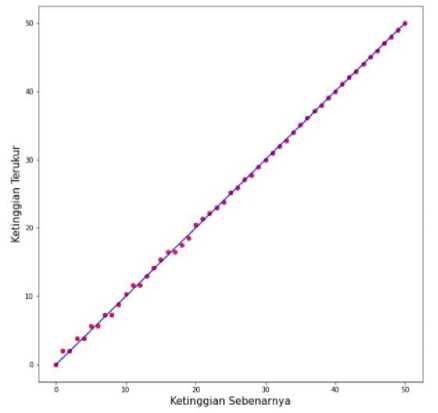 Nilai regresi dapat dilihat pada Gambar 8. Salah satu hasil dari analisa linear regression yang diperoleh menggunakan IBM SPSS yaitu tabel model summary. Tabel ini menunjukan nilai R^2 = 1 dan r = 0,999 [20]. Berdasarkan persyaratan nilai korelasi (r) yakni harus lebih besar dari 0,995, dengan nilai r yang diperoleh sebesari 0,999 maka dapat dinyatakan bahwa hasil linearitas valid dan terdapat korelasi antara jarak terukur dan jarak sebenarnya.