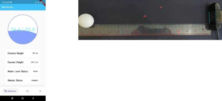 Hasil pengukuran yang telah didapat akan dikirimkan ke aplikasi mobile. Tampilan pada mobile apps di sebelah kanan menunjukan ketinggian air yang didapat pada perangkat IoT. TMA maksimum yang digunakan pada pengujian ini adalah 60 cm, sehingga ketinggian air dapat dihitung dengan mengurangi TMA maksimum dengan jarak yang didapat. Hasil dari pengukuran ketinggian air yang didapat pada pengujian ini adalah 24 cm dengan jarak antara objek terhadap kamera adalah 35.6 cm.