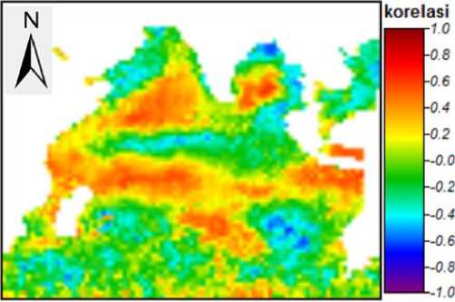 Berdasarkan peta korelasi IOD dengan salinitas seperti Gambar 10, dapat terlihat banyak korelasi positif yang terdapat di dalam peta, terutama di bagian barat dan timur samudera hindia, tetapi ada juga korelasi negatif yang terjadi seperti di daerah barat Australia dan daerah dekat teluk Bengala di India. Tetapi tidak ada koefisien korelasi yang sampai melebihi 0.8 atau -0.8, ini menunjukkan hubungan antara IOD dan salinitas tidak memiliki hubungan yang sangat erat, namun IOD memang sangat berpengaruh terhadap salinitas di Samudera Hindia mengingat hampir seluruh titik memiliki korelasi yang cukup tinggi.