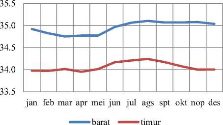 Gambar 9. Grafik salinitas (psu) di barat dan timur Samudera Hindia.