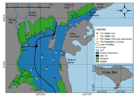 Penelitian ini dilakukan di Perairan Teluk Benoa dan sungai yang bermuara di Teluk Benoa. Waktu pengambilan data insitu dilakukan pada tanggal 12 Desember 2016. Simulasi model dilakukan mulai dari tanggal 10 Desember 2016 sampai 25 Januari 2017 pada saat musim hujan agar dapat diketahui variasi laju sedimentasi pada musim hujan pada saat masukan sedimen tertinggi dari sungai (Risuana et al., 2017). Penelitian ini menggunakan 14 titik pengambilan sampel data insitu pada Perairan Teluk Benoa dan 4 titik pengambilan sampel pada setiap sungai yang bermuara di Perairan Teluk Benoa. Lokasi pengambilan sampel dapat di lihat pada Gambar 1.