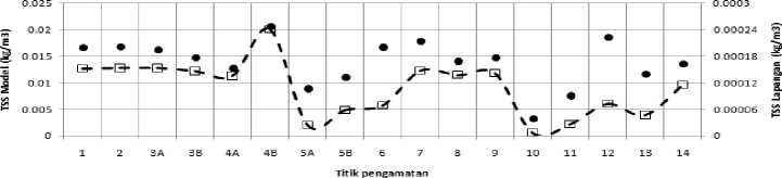 Validasi konsentrasi TSS dilakukan dengan membandingkan konsentrasi TSS hasil dari simulasi model numerik dengan observasi lapangan seperti terlihat pada Gambar 10.